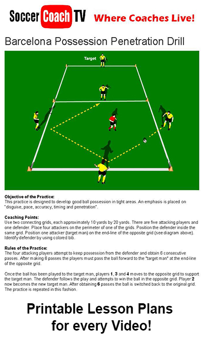 The four attacking players attempt to keep possession from the defender and obtain 6 consecutive passes. After making 6 passes the players must pass the ball forward to the "target man" at the end-line of the opposite grid.
