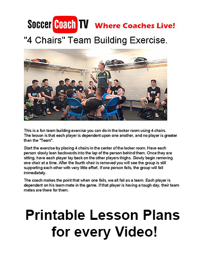 This is a fun team building exercise you can do in the locker room using 4 chairs. The lesson is that each player is dependent upon one another, and no player is greater than the "Team". Start the exercise by placing 4 chairs in the center of the locker room. Have each person slowly lean backwards into the lap of the person behind them.