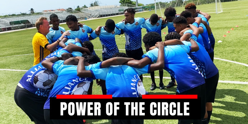 In this team building exercise, the coach emphasizes team strength in numbers with a circle game.The group of players links arms to form a circle. One player is positioned outside the circle, they get 10 seconds to penetrate the circle. The group has to work together as a team to keep the player outside the circle.